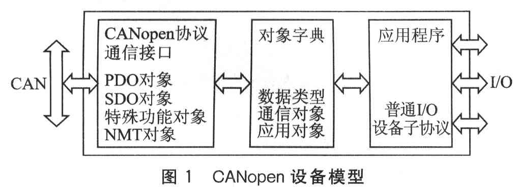 ??? CANopen協(xié)議是CiA協(xié)會(huì)基于CAN總線定義的應(yīng)用層協(xié)議之一,在各種控制系統(tǒng)中得到了廣泛應(yīng)用。它以CAN芯片為硬件基礎(chǔ),有效利用CAN芯片所提供的簡單通信功能來滿足工業(yè)控制網(wǎng)絡(luò)的復(fù)雜應(yīng)用層協(xié)議要求。CANopen網(wǎng)絡(luò)是主從站(Master—Slave)結(jié)構(gòu),系統(tǒng)的運(yùn)行由主站控制,主站可以對(duì)127個(gè)從設(shè)備進(jìn)行控制,不同設(shè)備通過CAN總線進(jìn)行連接組網(wǎng)。圖1為CANopen設(shè)備模型。CANopen通信協(xié)議接口用于提供在總線上收發(fā)通信對(duì)象的服務(wù),不同CANopen設(shè)備間的通信都是通過交換通信對(duì)象來完成的。CANopen協(xié)議中定義了4種通信對(duì)象(通信模式),用于對(duì)不同作用的信息進(jìn)行處理:NMT對(duì)象(網(wǎng)絡(luò)管理對(duì)象)、SDO對(duì)象(服務(wù)數(shù)據(jù)對(duì)象)、PDO對(duì)象(過程數(shù)據(jù)對(duì)象)、特殊功能對(duì)象。