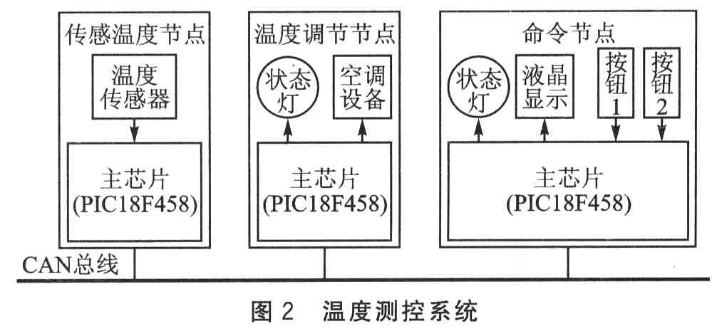 ??? 圖2所示溫度測控系統(tǒng)包含3個(gè)節(jié)點(diǎn),它們構(gòu)成一個(gè)CAN網(wǎng)絡(luò)。傳感溫度節(jié)點(diǎn)發(fā)送測到的溫度,此節(jié)點(diǎn)由主芯片和溫度傳感器組成。溫度調(diào)節(jié)節(jié)點(diǎn)接收到從傳感溫度節(jié)點(diǎn)發(fā)送的溫度數(shù)據(jù)后,低于下限溫度加熱,高于上限溫度降溫,并發(fā)送調(diào)節(jié)狀態(tài);此節(jié)點(diǎn)由主芯片、狀態(tài)顯示燈和空調(diào)設(shè)備組成。命令節(jié)點(diǎn)接收從傳感溫度節(jié)點(diǎn)發(fā)送的溫度和溫度調(diào)節(jié)節(jié)點(diǎn)發(fā)送的狀態(tài)在液晶屏上顯示,并有按鈕可以發(fā)送NMT對(duì)象,對(duì)整個(gè)系統(tǒng)進(jìn)行控制;此節(jié)點(diǎn)由主芯片、液晶屏、狀態(tài)顯示燈和按鈕組成。