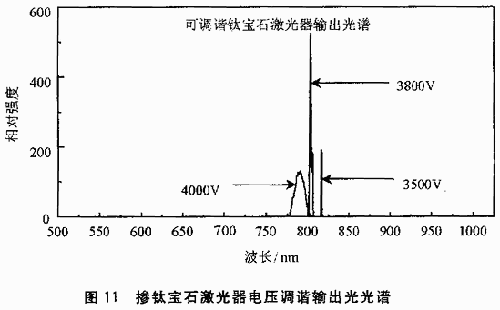 下面給出利用信號采集系統(tǒng)得到的實測光譜。圖11是用CCD實測的閃光燈泵浦可調(diào)諧摻鈦寶石激光器的輸出光譜。通過在激光腔內(nèi)加一鈮酸鈮晶體光電開關(guān),改變鈮酸晶體上的電壓,使不同波長的光在激光腔內(nèi)發(fā)生振蕩,從而實現(xiàn)鈦寶石調(diào)諧。這是一種新型的實現(xiàn)鈦定石調(diào)諧的實驗方法,圖11所示光譜線就是改變鈮酸鈮晶體電壓,用CCD實測的鈦寶石激光器的輸出光譜線。每改變一次電壓就能很快地、準確地得知輸出光的波長和帶寬。