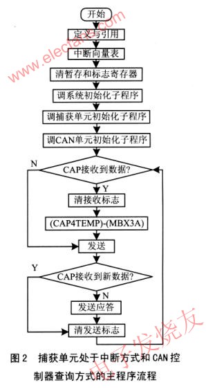 首先進行系統初始化,包括關中斷、清標志位、系統時鐘20MHz使能包含有捕獲單元的第4級中斷INT4,再進行捕獲單元初始化和CAN控制器初始化。有關內容前已敘述。由于捕獲單元處于中斷方式,從捕獲堆棧FIFO的取捕獲周期值的操作在捕獲單元的中斷處理程序中進行;而CAN控制器處于查詢方式,要在主程序中循環檢查捕獲標志。確認捕獲后,從暫存寄存器CAP4TEMP中取出捕獲周期值送到郵箱3。值得一提的是,由于捕獲周期值為1 6位數據,故需要傳送的數據是2字節。因此發送控制器MSGCTRL3的DL=2。這種情況的程序流程如圖2所示。