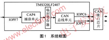 通常情況下,測速傳感器系統輸出的是數字測速脈沖信號。因此,可把這個加到TMS320LF2407DSP芯片捕獲引腳上。利用TMS320LF2407芯片的捕獲單元測量輸入脈沖的周期,再由內置的CAN總線控制器單元發出CAN周期信號,實現測速和遠程傳送一體化。