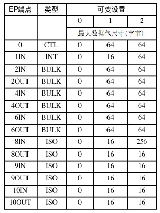 USB接口芯片完成枚舉后便可作為一個USB設備(缺省USB設備)與PC通信,由微控制器內核與PC建立通信聯系。缺省USB設備接口中包括一組14個EP 端點,如表1所示。
