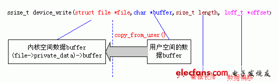?????? ?操作ssize_t device_write(struct file *file,const char *buffer, size_t length,loff_t *offset)向設備寫入數據。拷貝數據的copy_from_user()和copy_to_user()的功能恰恰相反,它是從用戶空間拷貝數據到內核空間,如圖5所示。