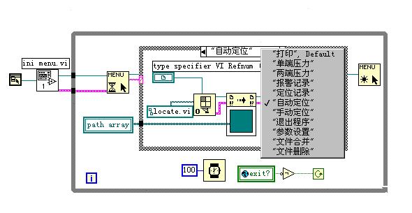用戶對系統(tǒng)的操作都設(shè)計為菜單操作,包括參數(shù)設(shè)置、文件處理、歷史數(shù)據(jù)、泄漏定位和退出系統(tǒng)等幾項。每一項菜單還有報警、都通過VI Server的方法動態(tài)調(diào)用,這樣既節(jié)省內(nèi)存,又使程序結(jié)構(gòu)清晰,模塊化好。