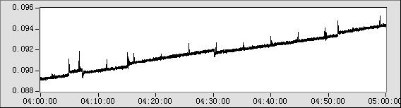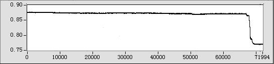 首先,因為不同條件(管徑、溫度、壓力、輸送工藝、環(huán)境噪聲等)下的信號具有不同的特征,我們利用LabVIEW中豐富的信號處理函數(shù)對信號的特征作了深入的研究分析和預(yù)處理,使得系統(tǒng)能夠針對不同的信號做出相應(yīng)的處理。例如,在滄州首站,啟泵的時候信號中含有比較有規(guī)律的尖銳噪聲,雖然幅度并不大(只有約千分之一兆帕),卻因為壓力比較低而非常明顯,如圖3。針對這樣的情況,我們使用了中值濾波器。中值濾波器能夠平滑尖銳噪聲,又能保持信號的邊沿,而且計算速度非??欤梢杂糜谠诰€處理。對比下面兩圖,可以看到濾波的效果。