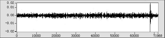 對信號作了一定預(yù)處理之后,我們采用Signal Processing軟件包里提供的小波分析的動態(tài)庫來捕捉壓力波變化的特征點。將含有負壓波信號的數(shù)據(jù)通過兩通道濾波器,分為低頻概貌和高頻細節(jié)兩路輸出,負壓波的位置就是高頻細節(jié)當(dāng)中最小值對應(yīng)的索引值。圖5為圖2所示信號的高頻結(jié)果。因為我們僅分析信號,不作重構(gòu),所選擇參數(shù)設(shè)計更為靈活的雙正交的濾波器組,而不必考慮對偶濾波器組是否收斂。利用Wavelet and Filter Bank Design Tookit提供的Design Panel 和1D Test Panel,我們在現(xiàn)場對于不同的信號可以方便地調(diào)整濾波器參數(shù),觀察濾波效果,大大提高了應(yīng)用的效率。