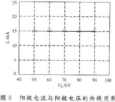 ??? (3)燈絲加熱電路的實驗。主要是對推挽變壓器和保護電路進行測試,防止輸出的17 kHz交流加熱信號中因漏感造成有過高的幅度燒壞燈絲。根據所選用X球管的情況,確定燈絲加熱的預熱時間比高壓產生部分的啟動信號早2~3 s,而關閉時間比高壓結束信號遲1 s。圖5為X球管在正常工作時高壓輸出信號和陽極電流的采樣波形。上面的波形為陽極電流Ia△7.2 mA,下面的波形為陽極高壓Va△68 kV。從波形可看出,整個陽極高壓穩定,高壓逆變器部分效率約為89%。圖6為陽極高壓與陽極電流的關系曲線。從圖中可以看出,陽極電流基本上不變,說明上面提到的燈絲加熱控制電路非常有效。??