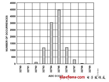 圖4顯示評估板端子板上的CH0至CH7短接到GND時,10,000個ADC的代碼樣本(1 kSPS時需要1秒)的曲線圖。請注意,95%的代碼處于4 LSB,峰峰值分布約為7 LSB。這對應于約7 ÷ 6.6 = 1.1 LSB的均方根值。