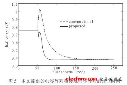 對于0~1V的范圍,Vref=1V,利用傳統單端的SAR ADC的二分法,可得到0.9V的電壓6bit輸出位111001但對于傳統差分,V+=0.95V,V-=0.05V時,6bit輸出位為