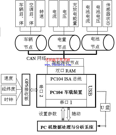 在整個(gè)的系統(tǒng)中,共有3類8個(gè)數(shù)據(jù)采集節(jié)點(diǎn),完成146項(xiàng)參數(shù)的采集。采集的數(shù)據(jù)通過(guò)CAN總線將數(shù)據(jù)發(fā)送到監(jiān)控節(jié)點(diǎn),監(jiān)控節(jié)點(diǎn)也通過(guò)微處理器完成總線上數(shù)據(jù)的接收。同時(shí),該節(jié)點(diǎn)通過(guò)雙口RAM和一臺(tái)PC104計(jì)算機(jī)的ISA總線通訊,PC104通過(guò)雙口RAM獲取監(jiān)控節(jié)點(diǎn)從總線上收到的數(shù)據(jù),并將數(shù)據(jù)進(jìn)行顯示和記錄。同時(shí),PC104還通過(guò)一個(gè)串行口直接接收GPS數(shù)據(jù)接收板的車輛速度、經(jīng)緯度和時(shí)鐘信息,并作為同步信息進(jìn)行記錄和顯示,以便將汽車的實(shí)時(shí)性能與速度和運(yùn)行地況聯(lián)系起來(lái)。信息每0.5秒記錄一次,采用變化記錄的數(shù)據(jù)壓縮算法,并以*.dat文件格式進(jìn)行存儲(chǔ)。