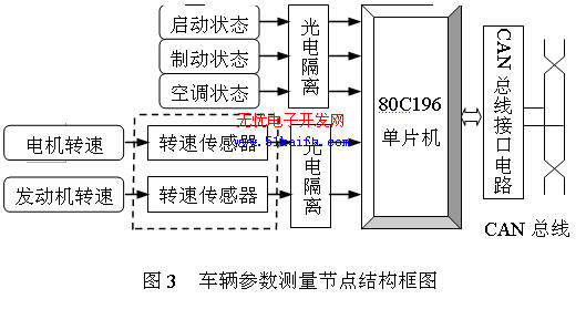 車輛節(jié)點(diǎn)采集的參數(shù)包括車輛啟動(dòng)、停止的狀態(tài),空調(diào)的開關(guān)狀態(tài),電機(jī)與發(fā)動(dòng)機(jī)的轉(zhuǎn)速信息,從采集參數(shù)的特征來(lái)看,分為開關(guān)量和頻率量。對(duì)于開關(guān)量的采集,無(wú)需額外的傳感器,只需要將電壓信號(hào)通過(guò)光電耦合直接輸入微處理器的輸入口即可檢測(cè);對(duì)于頻率量的轉(zhuǎn)速,我們選用了霍爾傳感器進(jìn)行測(cè)量。在輸出軸上貼磁鋼片,當(dāng)磁鋼片通過(guò)霍爾元件時(shí),霍爾傳感器輸出脈沖,此脈沖通過(guò)光電隔離輸入到80C196的高速輸入口,由于高速輸入口可以自動(dòng)記錄脈沖跳變的時(shí)刻,可以對(duì)脈沖進(jìn)行精確測(cè)量,而且高低頻率都適用。車輛采集節(jié)點(diǎn)的結(jié)構(gòu)框圖如圖3所示。
