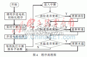 因為油位表、發動機轉速表和水溫表的數據都是從CAN總線傳過來的,所以將這三塊表的程序整理到同一個模塊中,轉速表和水溫表的函數功能與油位表相同。程序流程圖如圖4所示。