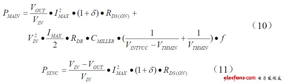 式中:δ是R DS (ON ) 的溫度系數, R DR約為4 歐姆,是在MOSFET 密勒門限電壓條件下有效驅動電阻, V THMIN是典型的MOSFET 的最小門限電壓。