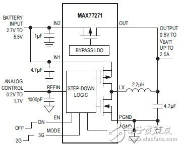 The MAX77271 step-down converter is optimized forpowering the power amplifier (PA) in multistandard handsetssuch as LTE, WCDMA, TD-SCDMA, GSM, andEDGE. The device integrates a high-efficiency PWM stepdownconverter for medium- and low-power transmissionwith an 85mΩ (typ) low dropout (LDO) bypass regulator,in parallel with the step-down converter, enabling highpowertransmission.