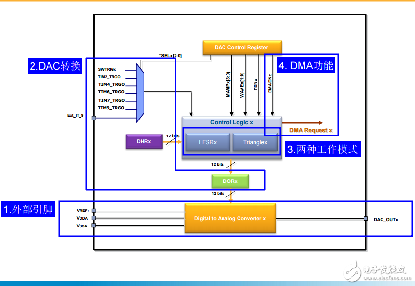 ? VREF+ 參考電壓(輸入) ? 1.8V 《= VREF+ 《= VDDA ? VDDA DAC模塊的供電引腳(輸入) ? 1.8V 《= VDDA 《= 3.6V ? 對于WLCSP封裝來說,供電電壓可低至1.65V ? VSSA DAC模塊的供電引腳(輸入) ? DAC_OUTX 模擬輸出信號? 輸出引腳:? PA.4 & PA.5,不具備5V容忍的GPIO ? 輸出引腳電壓: VREF+ * (DOR / 4095) ? 使能DAC通道之前,要先把對應引腳配置成”模擬輸入” ? 每個通道上都有輸出Buf,可配置成使能或關閉
