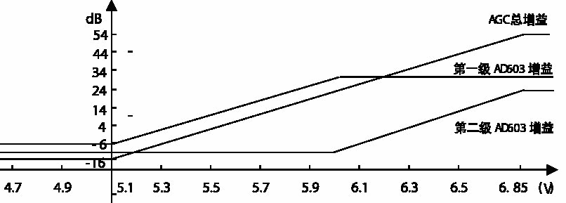 在無信號輸入時(shí),調(diào)整9018的靜態(tài)工作點(diǎn),使9018發(fā)射極的PN結(jié)處于近似截止?fàn)顟B(tài),并調(diào)整R7的阻值使得VAGC為6.85V,此時(shí)兩級AD603的增益全部放開,即54dB;當(dāng)有信號輸入,但其信號強(qiáng)度尚不能使9018發(fā)射極的PN結(jié)導(dǎo)通時(shí),AGC處于失控狀態(tài),輸出信號將隨著輸入信號強(qiáng)度的增大而增大;當(dāng)信號強(qiáng)度足以使9018發(fā)射極的PN結(jié)導(dǎo)通時(shí),9018處于AGC檢波狀態(tài),此時(shí)AGC開始起控,VAGC大約以25mV/dB的速率下降,直至下降到5.1V。對應(yīng)的兩級AD603的增益也開始逐漸從54dB下降到-16dB,先是第二級AD603的增益逐漸從24dB下降到-10dB,然后第一級AD603的增益也開始逐漸從30dB下降到-6dB。此時(shí),AGC進(jìn)入飽和點(diǎn),輸入信號強(qiáng)度再增大時(shí),AGC已失去控制作用,輸出信號又將隨著輸入信號強(qiáng)度的增大而增大。這就是AGC的整個控制過程,即隨著輸入信號強(qiáng)度的不斷增大,AGC將歷經(jīng)失控、開始起控、進(jìn)入飽和、再次失控的控制過程。