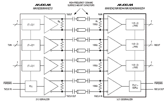 The MAX9209/MAX9244 evaluation kit (EV kit) provides a proven design to evaluate the MAX9209 21-bit programmable DC-balanced serializer and the MAX9244 21-bit deserializer with programmable spread spectrum and DC balance. The MAX9209 serializes 21 bits of LVCMOS/LVTTL parallel input data to three LVDS outputs.