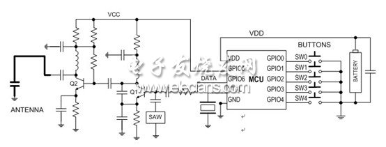 66 該四路遙控器發(fā)射電路主要由315MHz無線數(shù)據(jù)發(fā)射模塊和編碼集成PT2262組成。