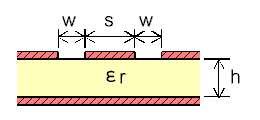 | 1. Input the parameter of the circuit board and center frequency. 2. (1) When the character impedance (Zo) of the conductor space (w) is computed. Input w, and click on [ Analyze ] button. (2) When the conductor space (w) of the character impedance (Zo) is calculated. Input Zo, and click on [ Synthesis ] button. 3. A calculation result is indicated. |