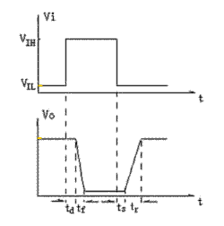 ????瞬態(tài)特性?由于寄生電容和晶體管載流子的存儲(chǔ)效應(yīng)的存在,輸入和輸出波形如?右。存在四個(gè)時(shí)間常數(shù)td,tf,ts和tr。