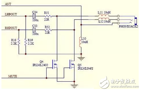 上圖是一個有主控控制耳機有沒有聲音輸出的電路圖,聲音的左右聲道分別通過隔直流電容C13、C14和電阻R51、R52送到耳機孔,但是在電阻R51、R52和耳機孔之間卻接入了一個N溝道的mos場效應管,這個場效應管的柵極連接在一起受著MUTE的控制,當MUTE的地方處于高電位時候,Q4、Q5導通,就會把聲音通過Q4、Q5入地,耳機里就不會有聲音了,當MUTE的地方處于低電位時候,Q4、Q5關斷,聲音就只有通過耳機而發出聲音了!
